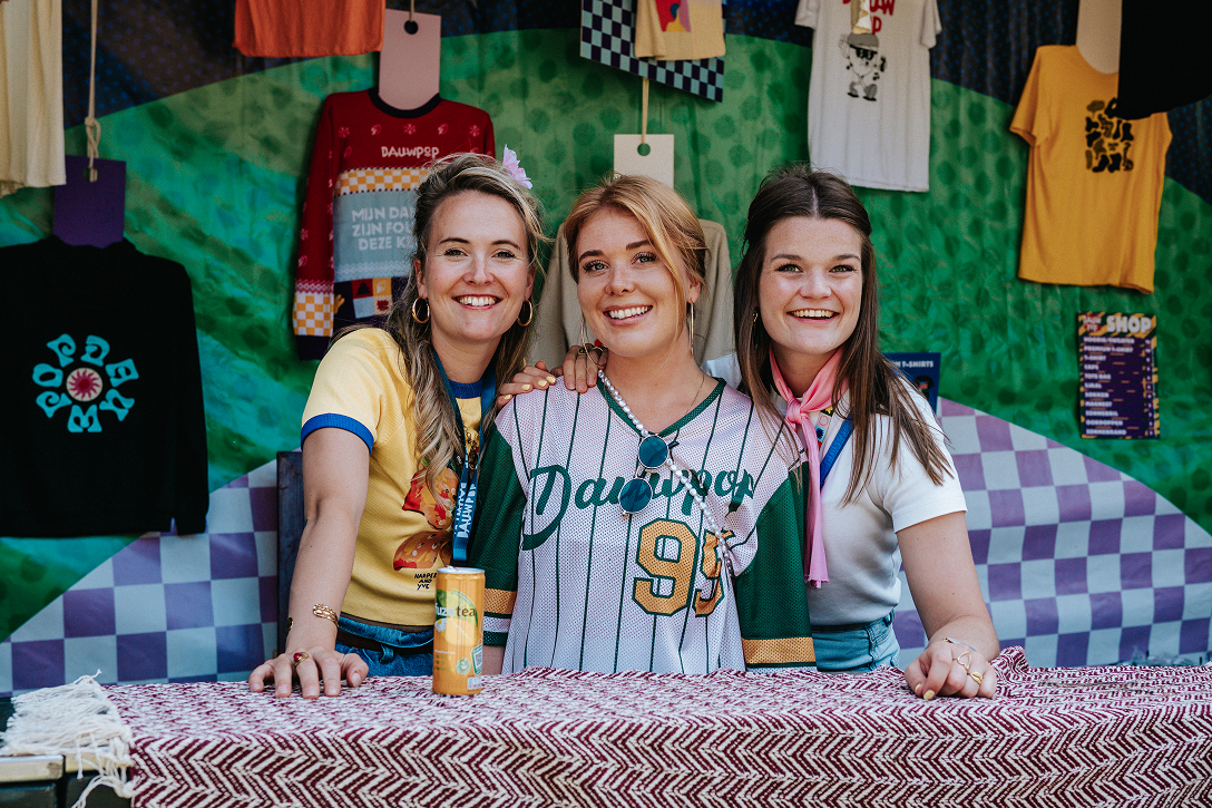 Naast het media-team verzorgden wij ook de Dauwpop merchandising. Onze creativiteit kon letterlijk gedragen worden in truien, T-shirts, sjaals, sokken en nog veel meer artikelen. We schoten content van de artikelen voor op de socials, kleedden de stand aan en verkochten de items tijdens het festival zelf met ons team en leuke vrijwilligers.